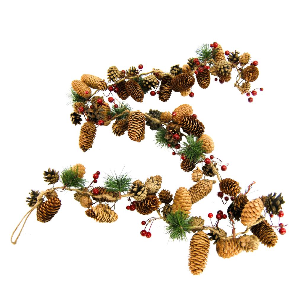 NATURAL PINECONE/RED BERRY GARLAND w/BELLS 150cm